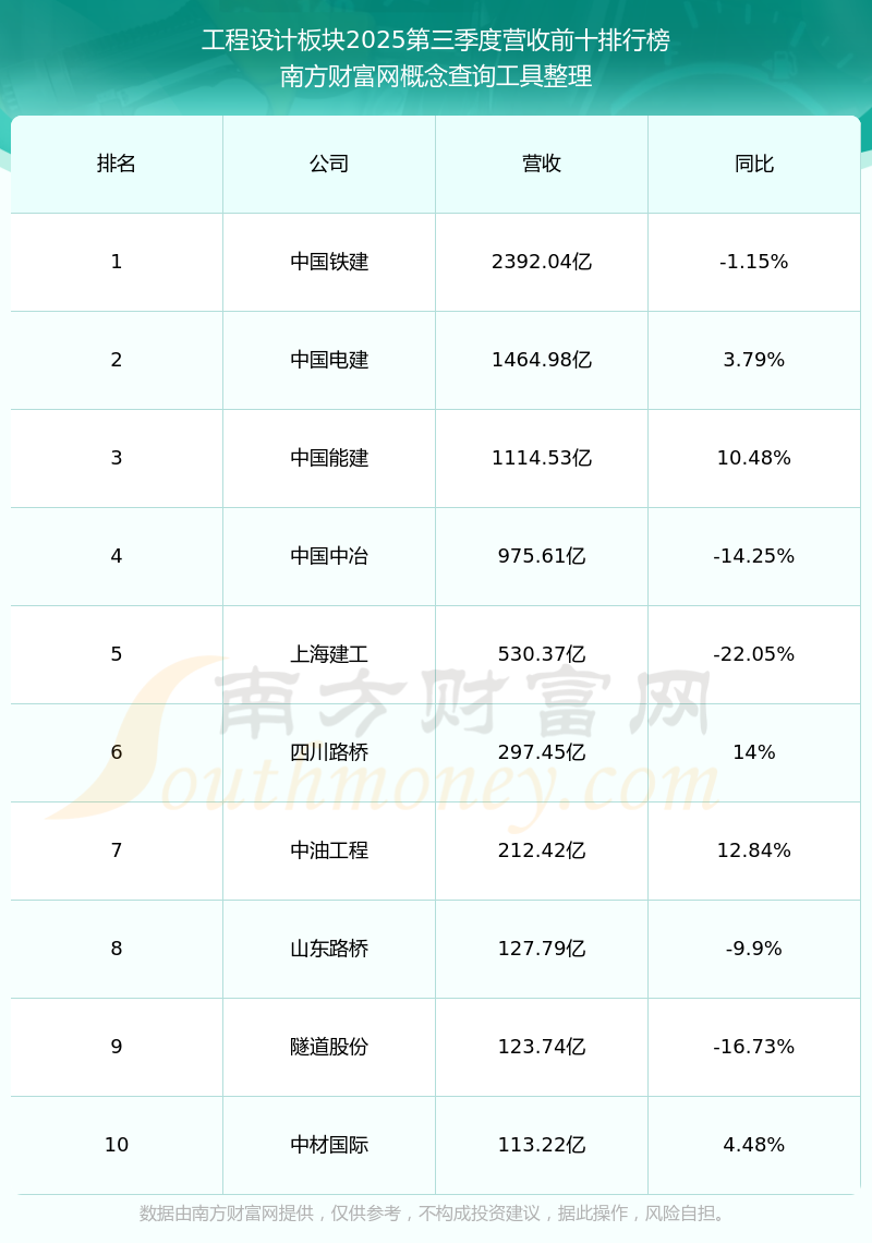 按照南方财富网概念查询工具统计,该股所属板块为工程设计板块,该板块共有78只股票,中国瑞林2025第三季度营收在该板块中排名为第41名,该板块2025第三季度营收排名前十的股票如下表: