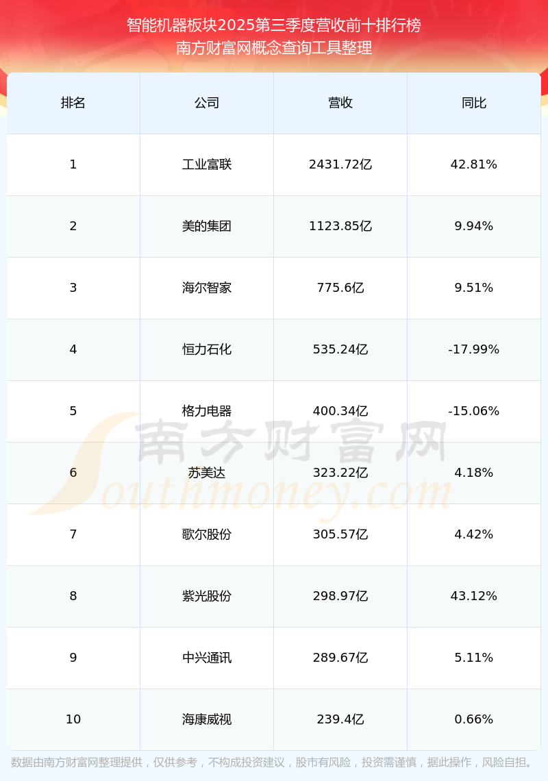 按照南方财富网概念查询工具统计,该股所属板块为智能机器板块,该板块共有253只股票,弘讯科技2025第三季度营收在该板块中排名为第208名,该板块2025第三季度营收排名前十的股票如下表: