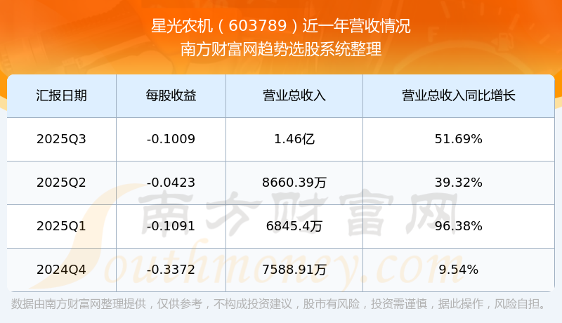 星光农机2025年第三季度公司实现营业收入1.46亿元,同比51.69%;归母净利润-2465.53万元,同比17.37%。