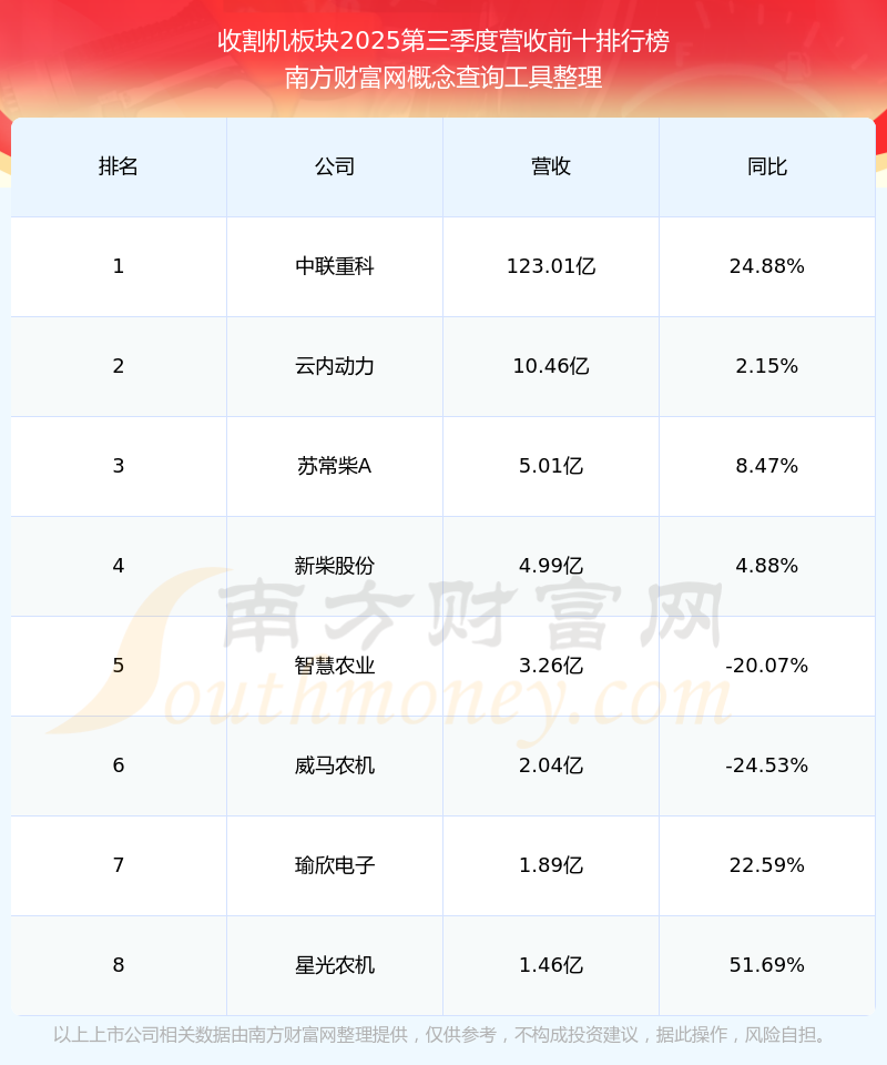 按照南方财富网概念查询工具统计,该股所属板块为收割机板块,该板块共有8只股票,星光农机2025第三季度营收在该板块中排名为第8名,该板块2025第三季度营收排名前十的股票如下表: