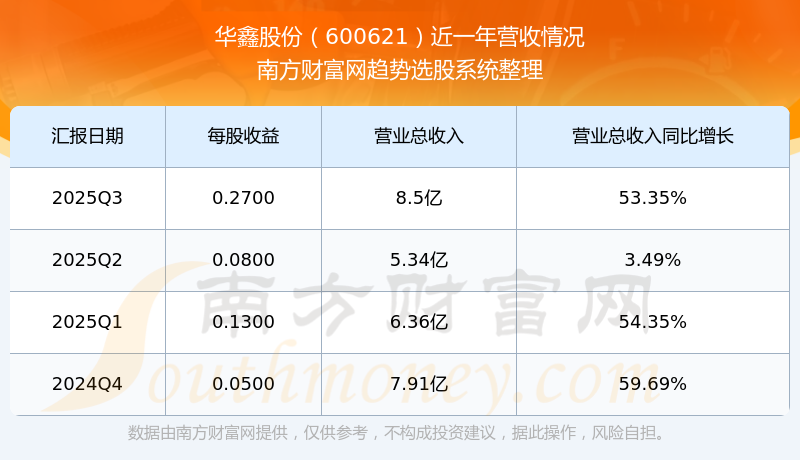 华鑫股份(600621)披露2025年第三季度报告,报告期实现营收8.5亿元,同比53.35%;归母净利润2.81亿元,同比83.77%;扣非净利润2.8亿元,同比83.29%;基本每股收益0.27元。
