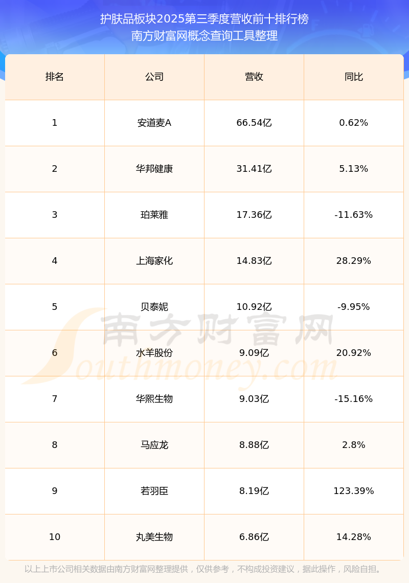 按照南方财富网概念查询工具统计,该股所属板块为护肤品板块,该板块共有26只股票,丽人丽妆2025第三季度营收在该板块中排名为第20名,该板块2025第三季度营收排名前十的股票如下表:
