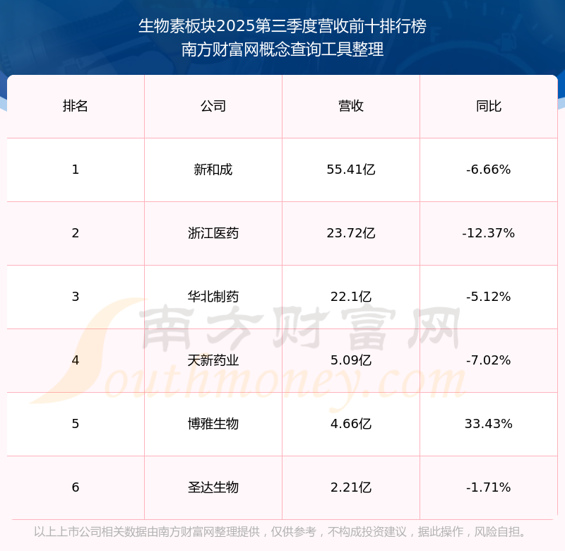 按照南方财富网概念查询工具统计,该股所属板块为生物素板块,该板块共有6只股票,天新药业2025第三季度营收在该板块中排名为第4名,该板块2025第三季度营收排名前十的股票如下表:
