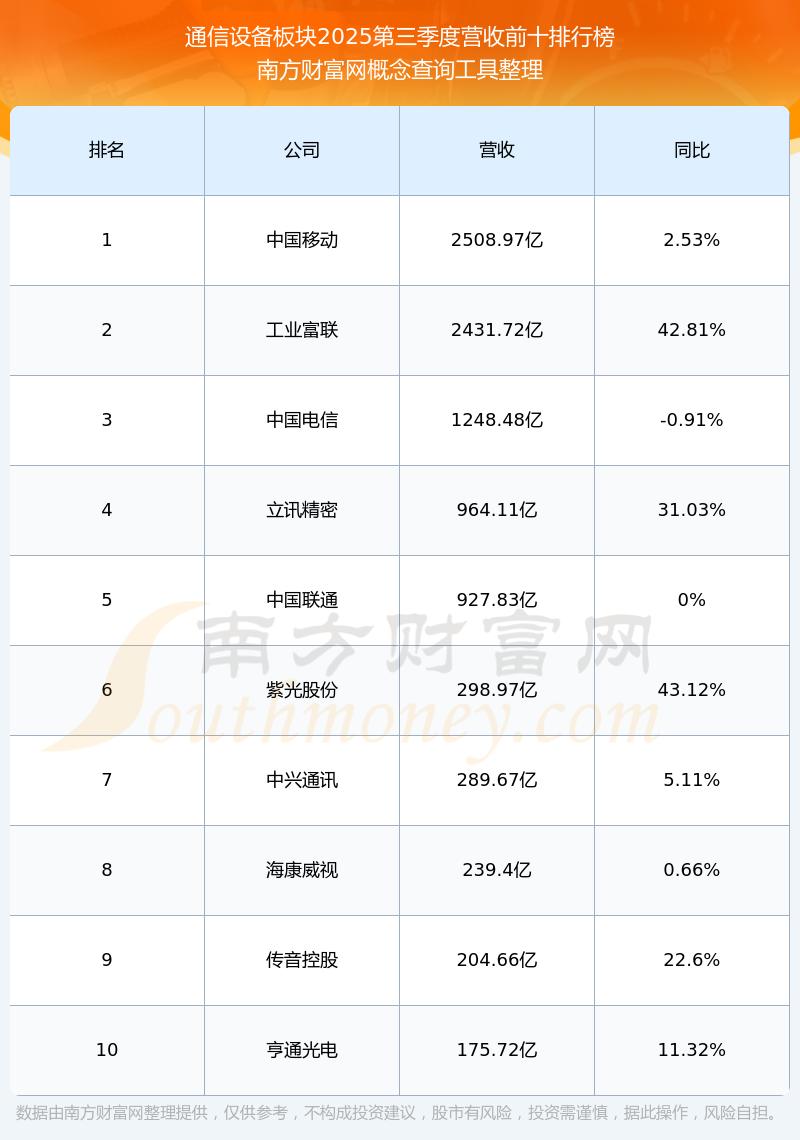按照南方财富网概念查询工具统计,该股所属板块为通信设备板块,该板块共有161只股票,高凌信息2025第三季度营收在该板块中排名为第157名,该板块2025第三季度营收排名前十的股票如下表: