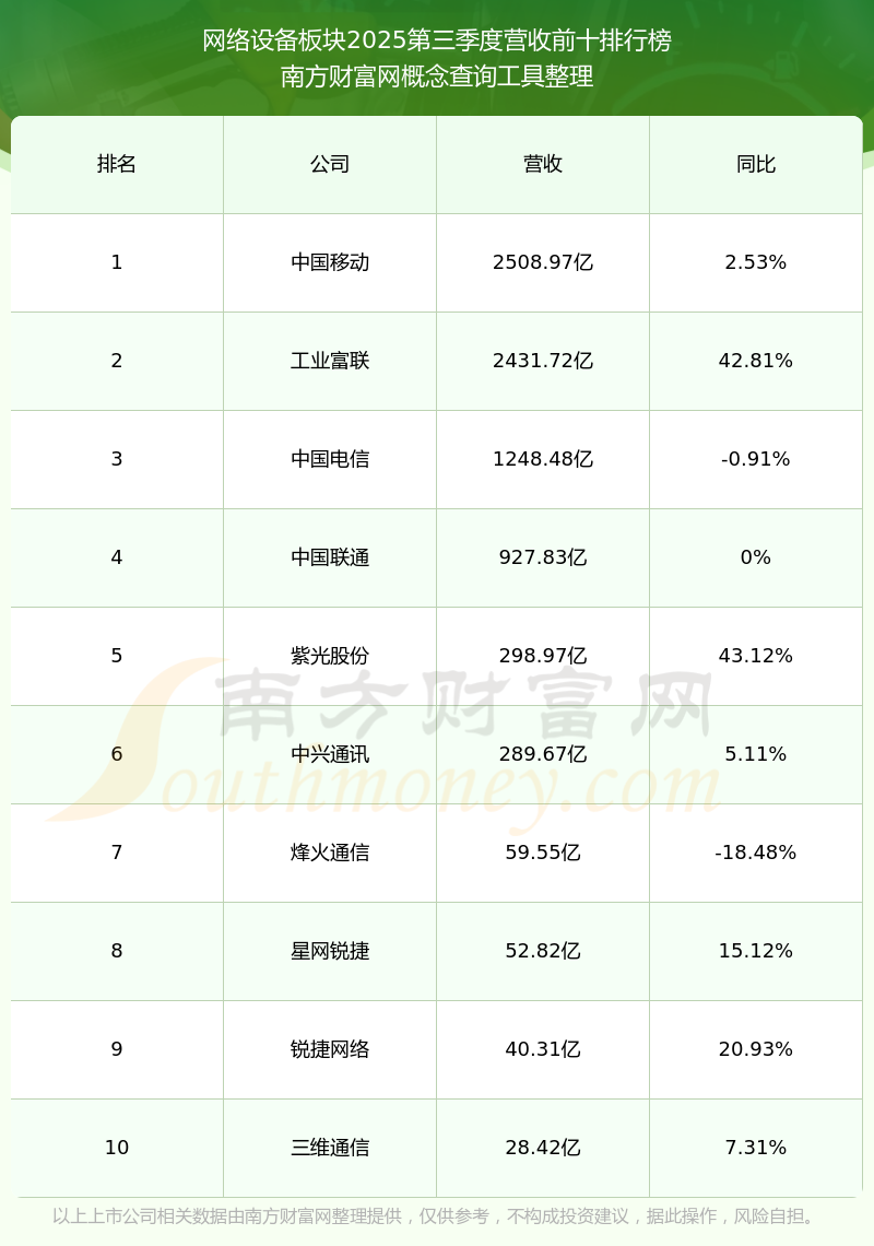 按照南方财富网概念查询工具统计,该股所属板块为网络设备板块,该板块共有27只股票,信科移动2025第三季度营收在该板块中排名为第27名,该板块2025第三季度营收排名前十的股票如下表: