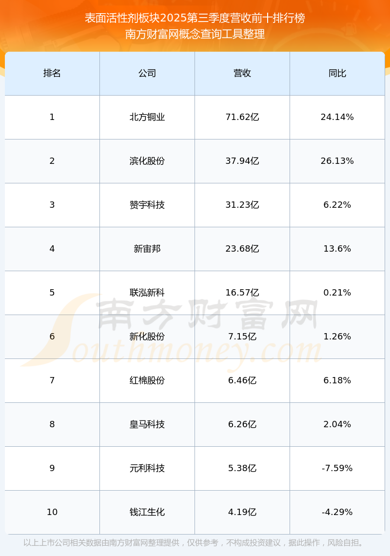 按照南方财富网概念查询工具统计,该股所属板块为表面活性剂板块,该板块共有14只股票,皇马科技2025第三季度营收在该板块中排名为第8名,该板块2025第三季度营收排名前十的股票如下表: