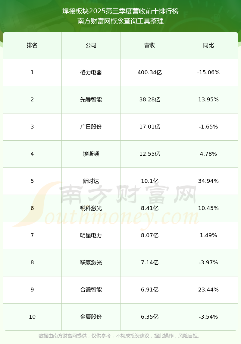 按照南方财富网概念查询工具统计,该股所属板块为焊接板块,该板块共有23只股票,联赢激光2025第三季度营收在该板块中排名为第8名,该板块2025第三季度营收排名前十的股票如下表: