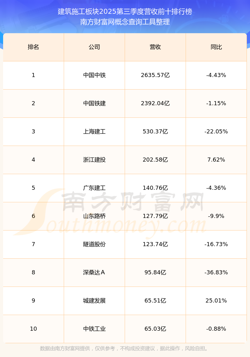 按照南方财富网概念查询工具统计,该股所属板块为建筑施工板块,该板块共有29只股票,汇通控股2025第三季度营收在该板块中排名为第26名,该板块2025第三季度营收排名前十的股票如下表: