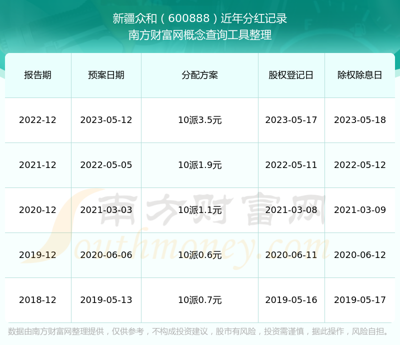 新疆众和最新一次公布的分红方案为10派3.5元。本次权益分派股权登记日为2023年5月17日,除权除息日为2023年5月18日,派息日为2023年5月18日。