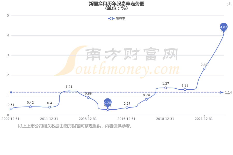 新疆众和历年股息率走势如下图: