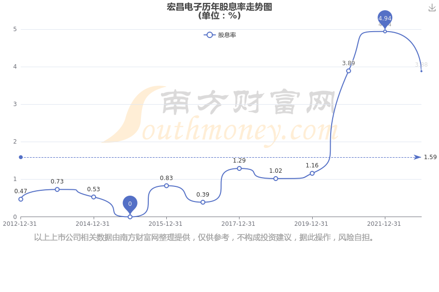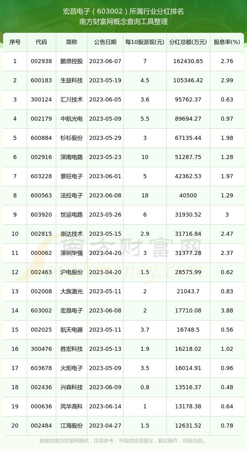 宏昌电子最新一次公布的分红方案为10派2元。本次权益分派股权登记日为2023年6月14日,除权除息日为2023年6月15日,派息日为2023年6月15日。
