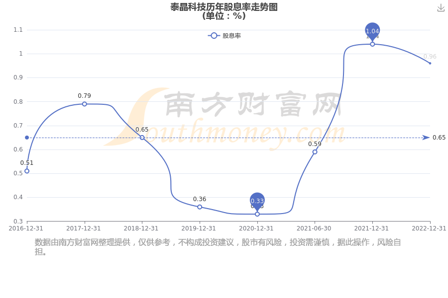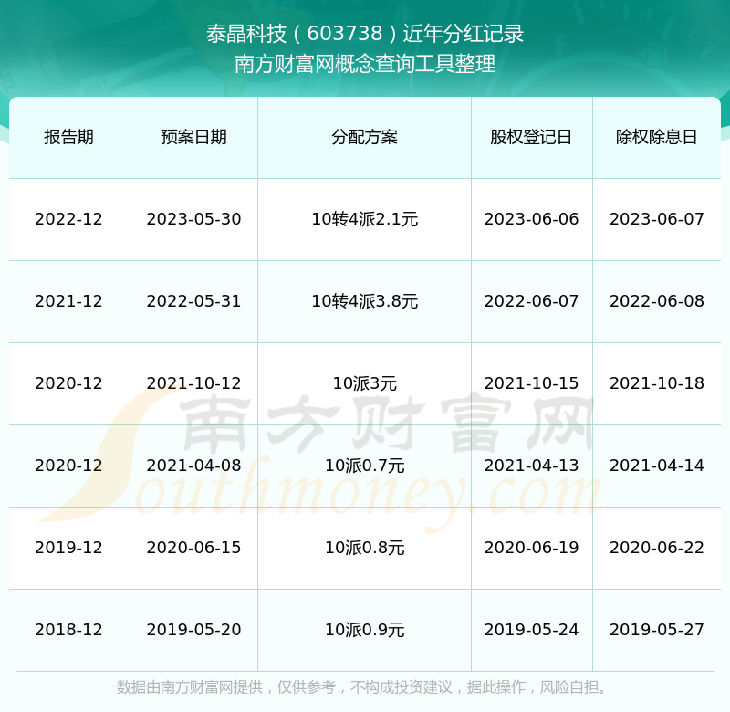 泰晶科技最新一次公布的分红方案为10转4派2.1元。本次权益分派股权登记日为2023年6月6日,除权除息日为2023年6月7日,派息日为2023年6月7日。