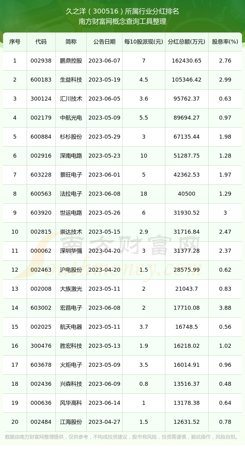 按照南方财富网趋势选股系统统计,久之洋所属行业为电子元件行业,电子元件行业分红排名情况如下表: