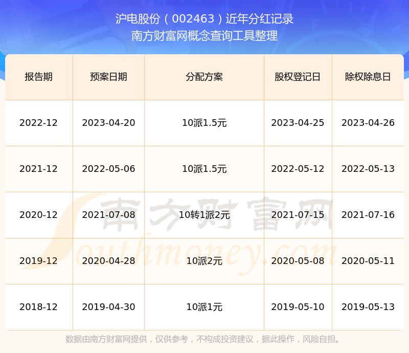 沪电股份最新一次公布的分红方案为10派1.5元。本次权益分派股权登记日为2023年4月25日,除权除息日为2023年4月26日,派息日为2023年4月26日。