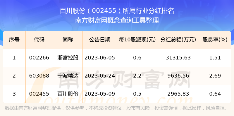 按照南方财富网趋势选股系统统计,百川股份所属行业为化工行业,化工行业分红排名情况如下表: