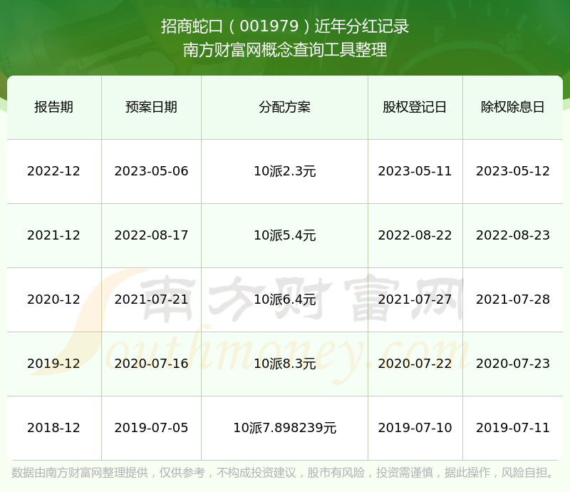 招商蛇口最新一次公布的分红方案为10派2.3元。本次权益分派股权登记日为2023年5月11日,除权除息日为2023年5月12日,派息日为2023年5月12日。
