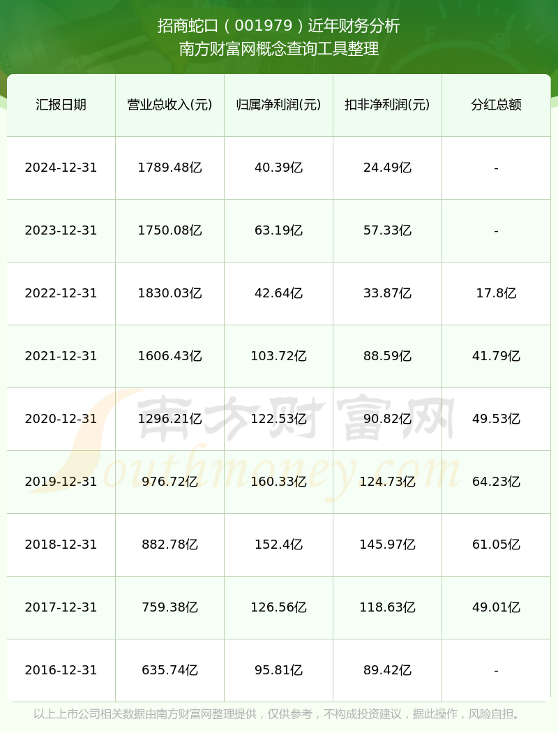 招商蛇口公司2024年实现营业收入1789.48亿元,同比增长2.25%;净利润40.39亿元,同比增长-36.09%;毛利率14.61%。