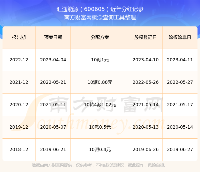 汇通能源最新一次公布的分红方案为10派1元。本次权益分派股权登记日为2023年4月10日,除权除息日为2023年4月11日,派息日为2023年4月11日。