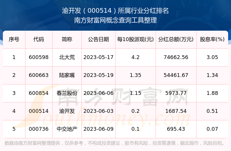 按照南方财富网趋势选股系统统计,渝开发所属行业为房地产行业,房地产行业分红排名情况如下表: