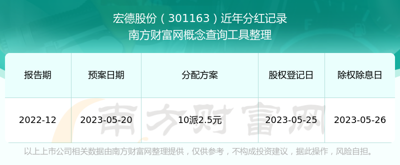 宏德股份最新一次公布的分红方案为10派2.5元。本次权益分派股权登记日为2023年5月25日,除权除息日为2023年5月26日,派息日为2023年5月26日。