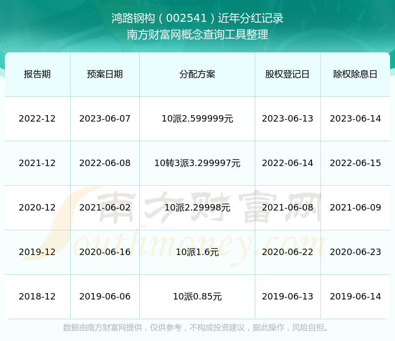 鸿路钢构最新一次公布的分红方案为10派2.599999元。本次权益分派股权登记日为2023年6月13日,除权除息日为2023年6月14日,派息日为2023年6月14日。