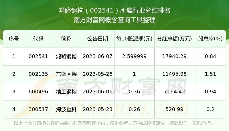 按照南方财富网趋势选股系统统计,鸿路钢构所属行业为钢结构行业,钢结构行业分红排名情况如下表: