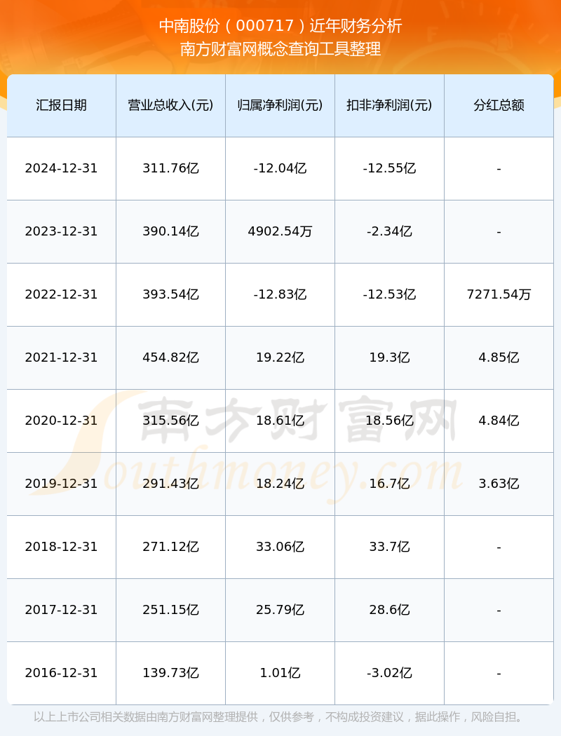 2024年中南股份总营收311.76亿,同比增长-20.09%;净利润-12.04亿,同比增长-2555.52%;销售毛利率-0.26%。