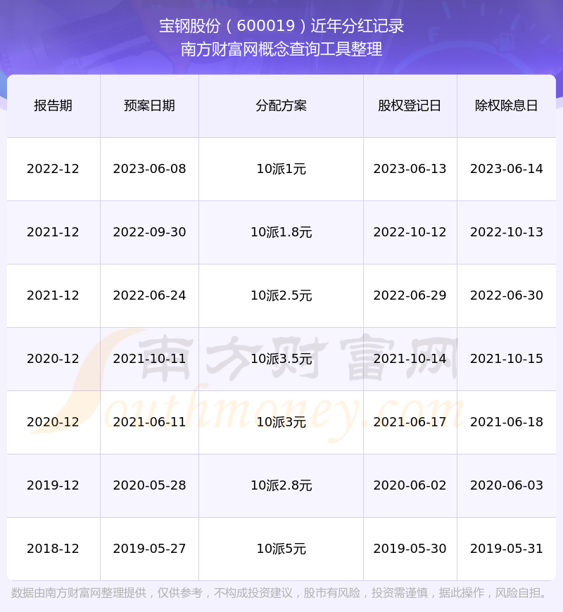 宝钢股份最新一次公布的分红方案为10派1元。本次权益分派股权登记日为2023年6月13日,除权除息日为2023年6月14日,派息日为2023年6月14日。