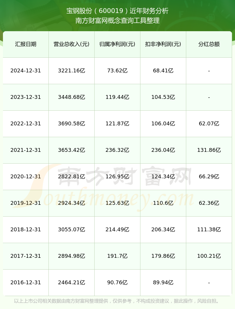 2024年报显示,宝钢股份实现营收3221.16亿,同比增长-6.6%;净利润73.62亿,同比增长-38.36%;毛利率5.45%。