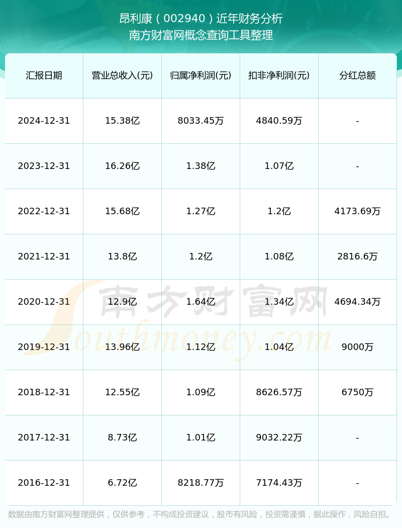 2024年昂利康总营收15.38亿,同比增长-5.41%;净利润8033.45万,同比增长-41.94%;销售毛利率40.13%。