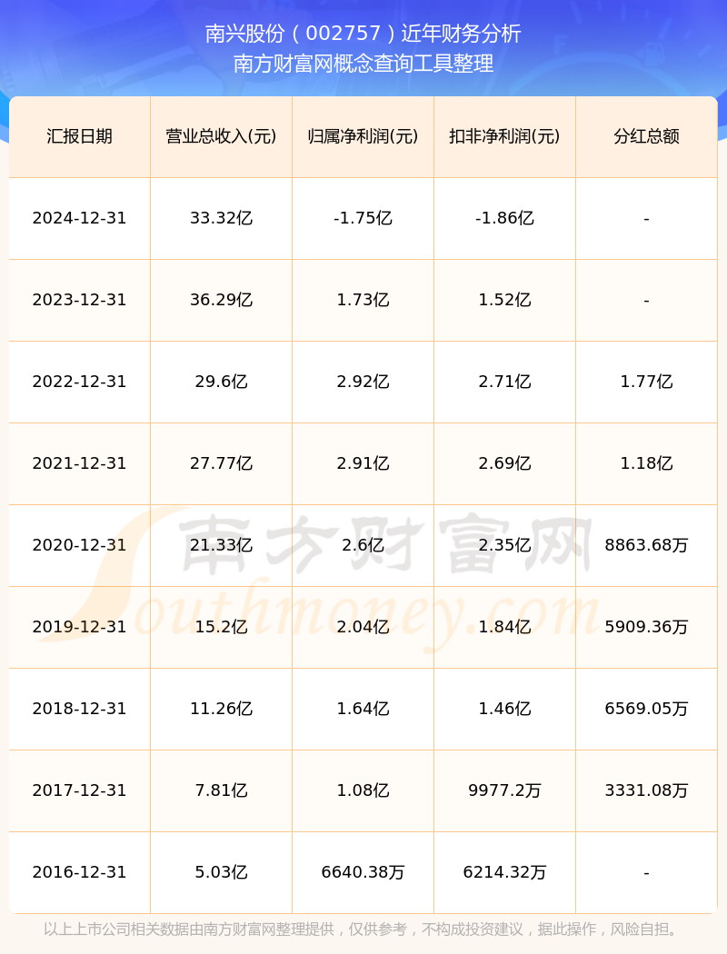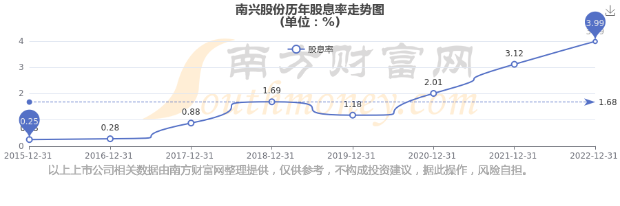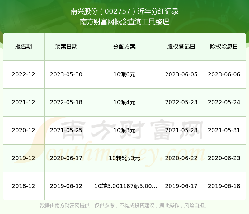 南兴股份最新一次公布的分红方案为10派6元。本次权益分派股权登记日为2023年6月5日,除权除息日为2023年6月6日,派息日为2023年6月6日。