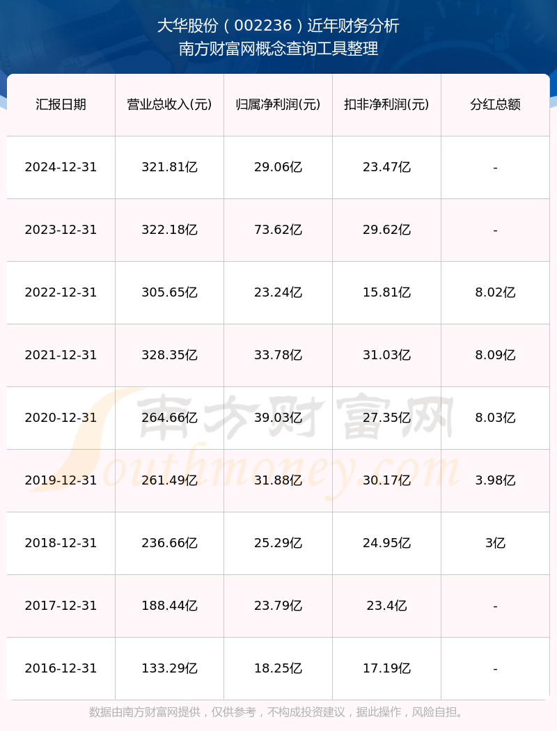 2024年大华股份总营收321.81亿,同比增长-0.12%;净利润29.06亿,同比增长-60.53%;销售毛利率38.84%。
