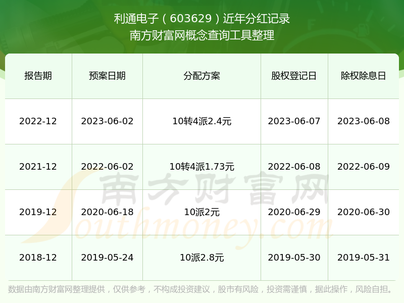 利通电子最新一次公布的分红方案为10转4派2.4元。本次权益分派股权登记日为2023年6月7日,除权除息日为2023年6月8日,派息日为2023年6月8日。