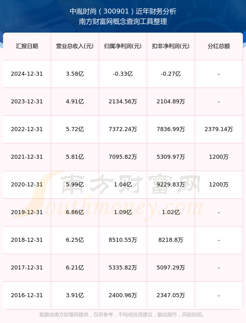 中胤时尚公司2024年实现营业收入3.58亿元,同比增长-26.96%;净利润-3322.61万元,同比增长-255.66%;毛利率16.59%。