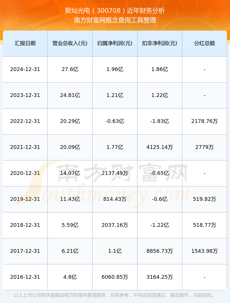 2024年报显示,聚灿光电实现营收27.6亿,同比增长11.23%;净利润1.96亿,同比增长61.44%;毛利率13.7%。