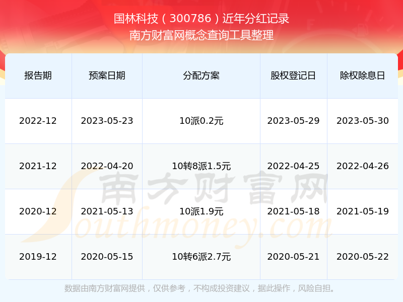 国林科技最新一次公布的分红方案为10派0.2元。本次权益分派股权登记日为2023年5月29日,除权除息日为2023年5月30日,派息日为2023年5月30日。