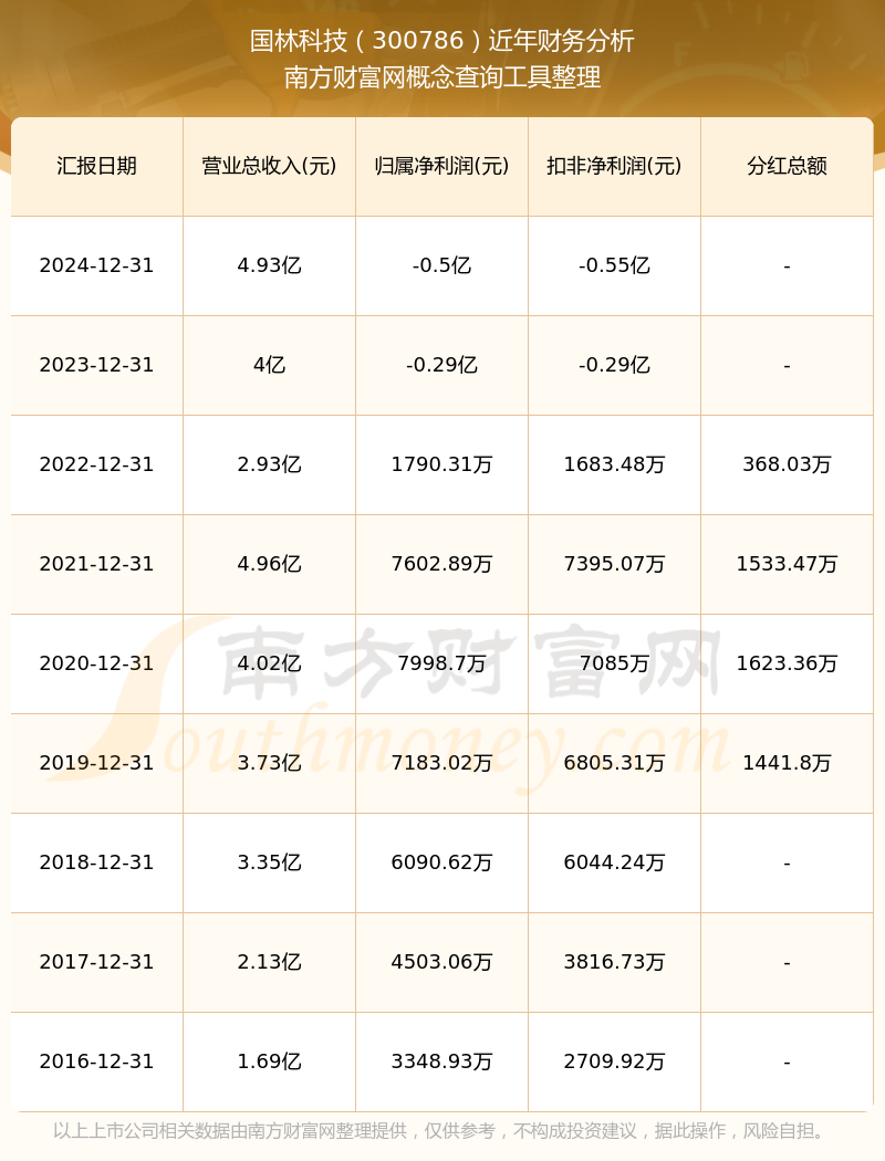 2024年国林科技总营收4.93亿,同比增长23.33%;净利润-4995.89万,同比增长-71.46%;销售毛利率21.04%。