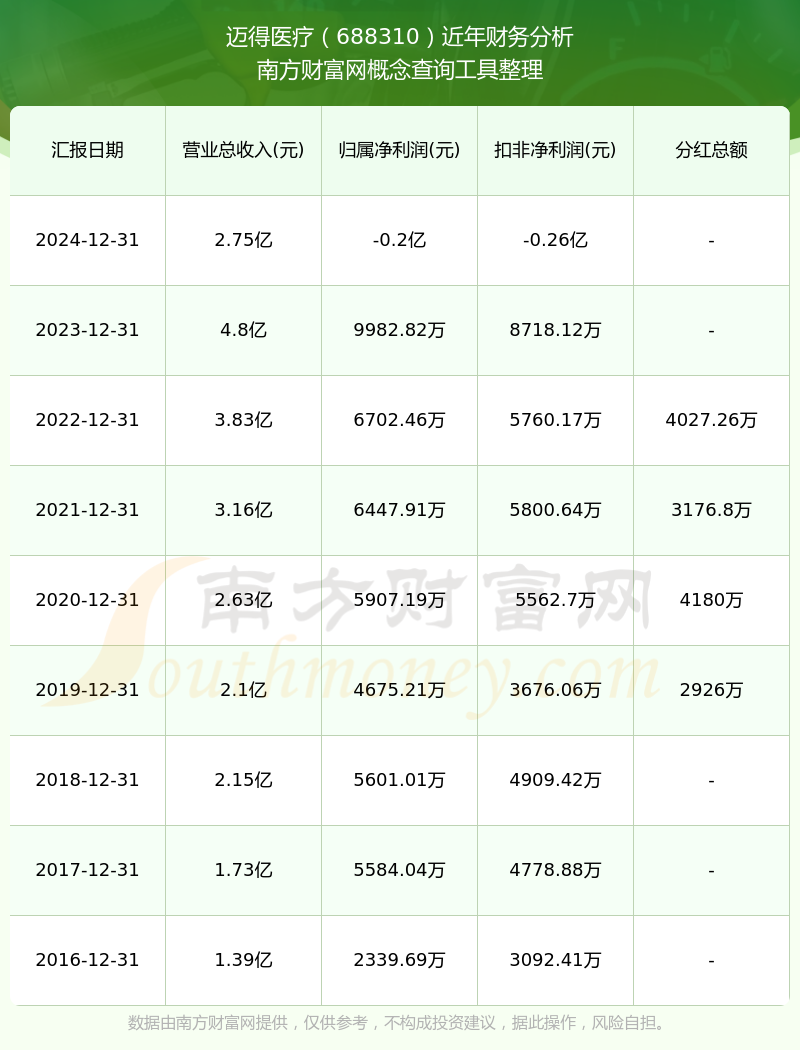 迈得医疗2024年总营收2.75亿,同比增长-42.77%;净利润-1998.12万,同比增长-120.02%;销售毛利率43.85%。