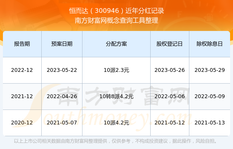 恒而达最新一次公布的分红方案为10派2.3元。本次权益分派股权登记日为2023年5月26日,除权除息日为2023年5月29日,派息日为2023年5月29日。