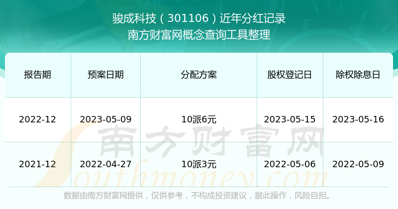 骏成科技最新一次公布的分红方案为10派6元。本次权益分派股权登记日为2023年5月15日,除权除息日为2023年5月16日,派息日为2023年5月16日。