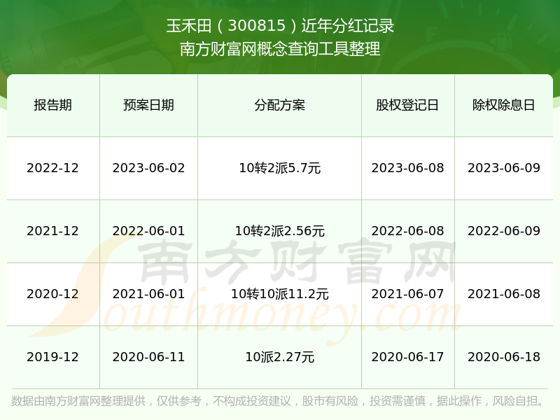 玉禾田最新一次公布的分红方案:10转2派5.7元。