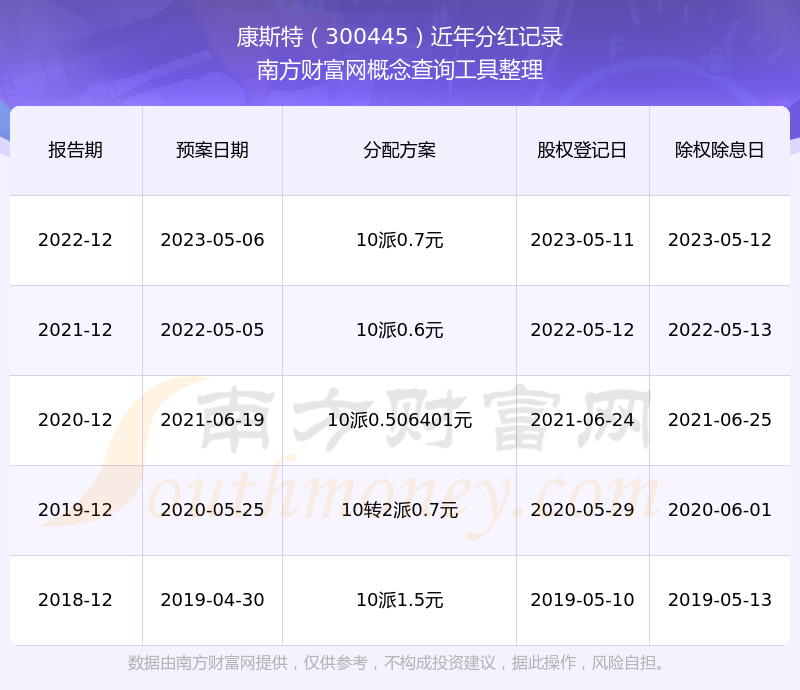 康斯特历年分红派息情况如下表所示: