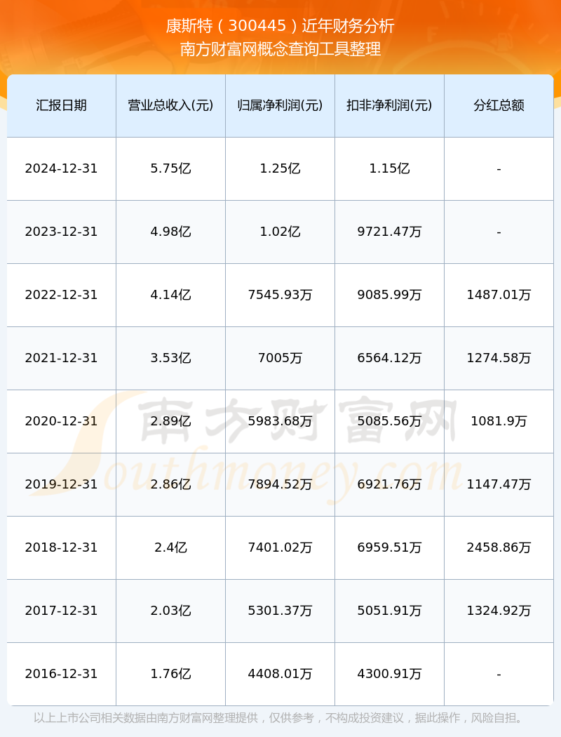 2024年报显示,康斯特实现营收5.75亿,同比增长15.48%;净利润1.25亿,同比增长23.07%;毛利率64.71%。