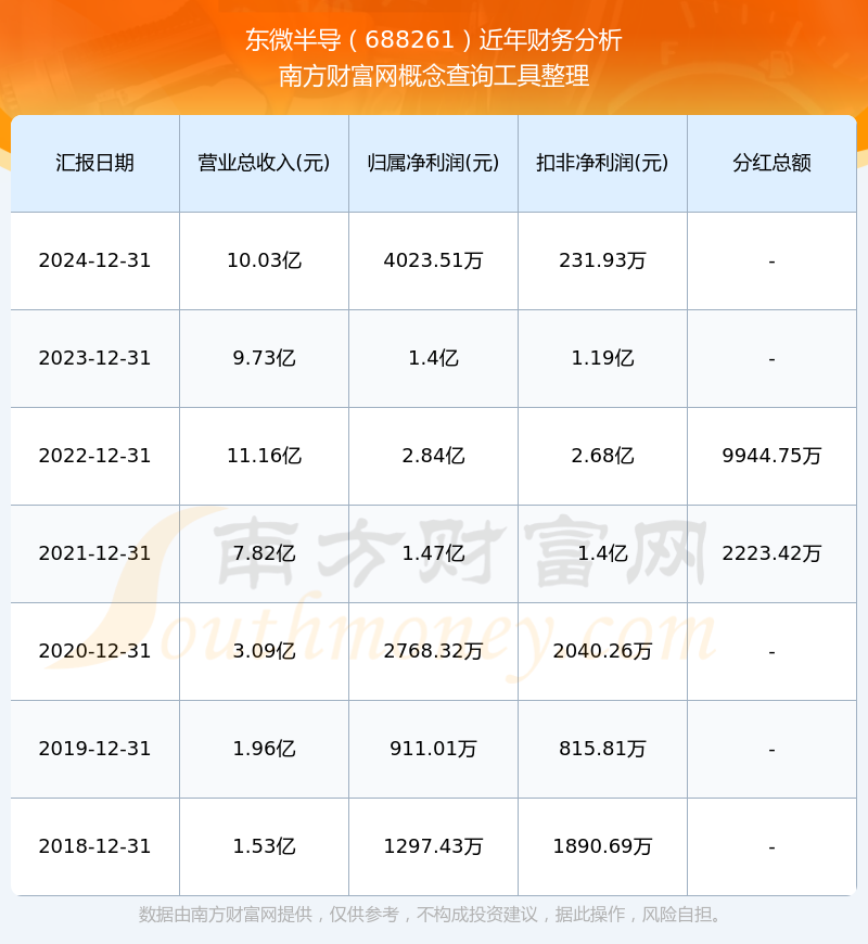 东微半导公司2024年实现营业收入10.03亿元,同比增长3.12%;净利润4023.51万元,同比增长-71.27%;毛利率14.29%。