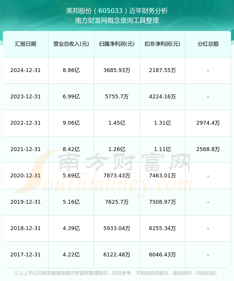 2024年报显示,美邦股份实现营收8.86亿,同比增长26.68%;净利润3685.93万,同比增长-35.96%;毛利率28.55%。