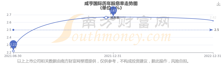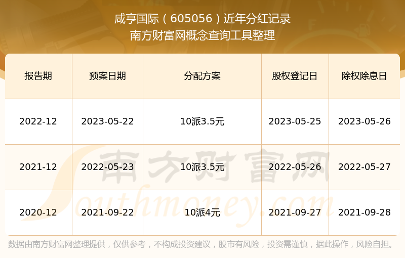 咸亨国际最新一次公布的分红方案为10派3.5元。本次权益分派股权登记日为2023年5月25日,除权除息日为2023年5月26日,派息日为2023年5月26日。