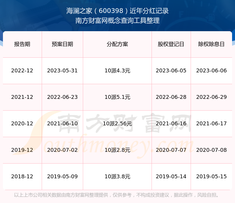 海澜之家最新一次公布的分红方案为10派4.3元。本次权益分派股权登记日为2023年6月5日,除权除息日为2023年6月6日,派息日为2023年6月6日。