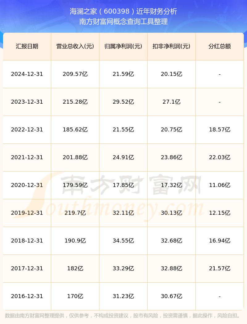 2024年报显示,海澜之家实现营收209.57亿,同比增长-2.65%;净利润21.59亿,同比增长-26.88%;毛利率44.52%。