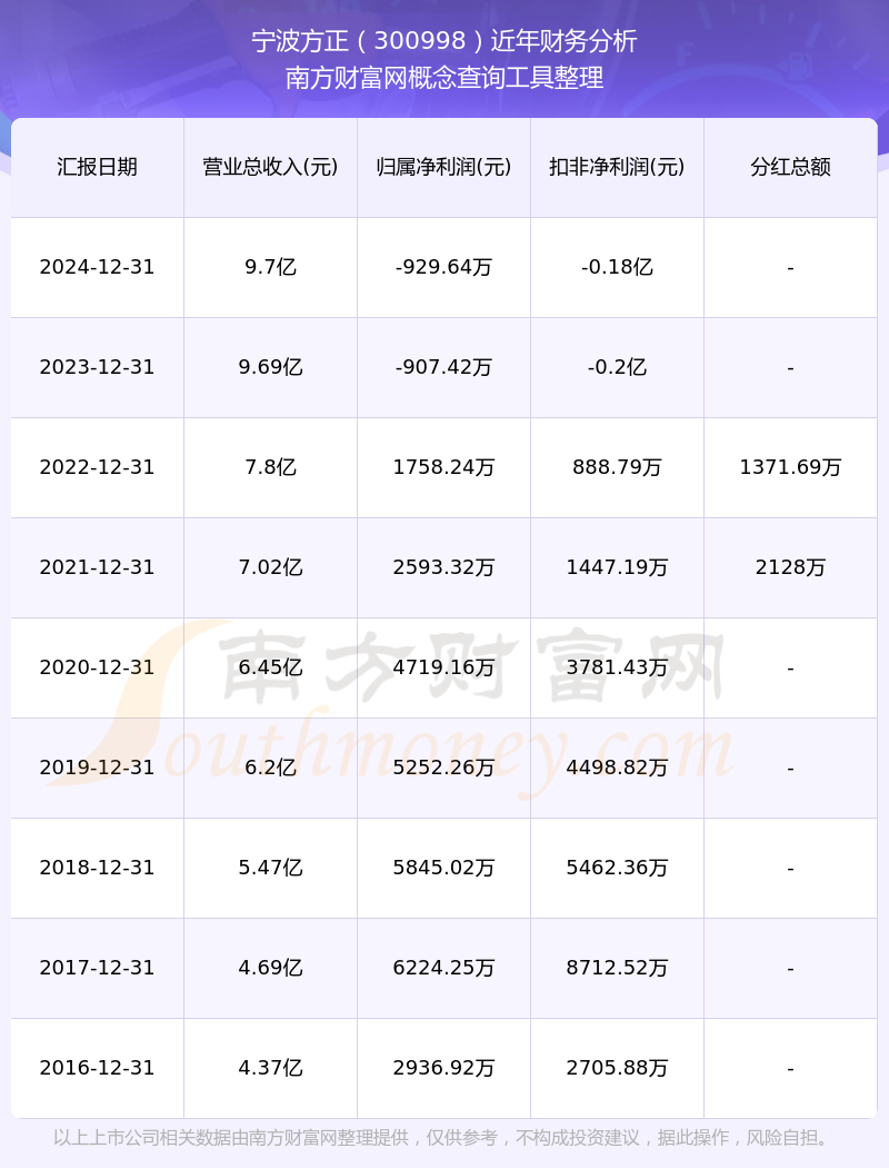 2024年宁波方正总营收9.7亿,同比增长0.08%;净利润-929.64万,同比增长-2.45%;销售毛利率15.29%。