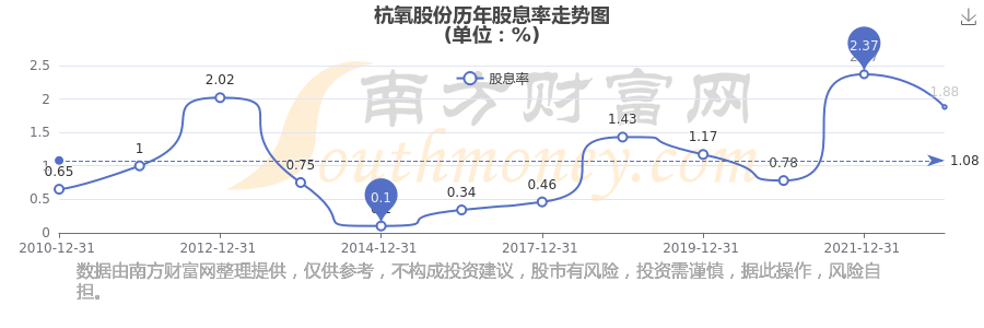 杭氧股份最新一次公布的分红方案为10派8元。本次权益分派股权登记日为2023年5月5日,除权除息日为2023年5月8日,派息日为2023年5月8日。